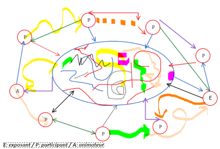 Pour illustrer la complexité de cet espace, Pierre Cieutat a réalisé lors du séminaire une figuration des interactions verbales et émotionnelles du groupe au travail. Elle exprime les affects mobilisés tout comme la représentation d’un partage, une mise au pot commun par l’émotionnel (voir figure ci-après).