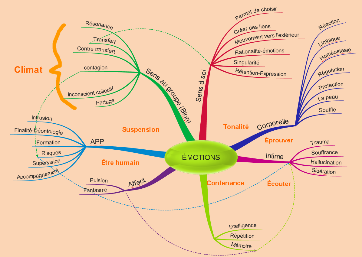 Les échanges ont mis en évidence la pluralité des angles de lecture de la thématique. Divers registres sont apparus tels que : le sens des émotions pour soi, pour le groupe, la place des affects[3], la fonction de contenance, la place de l’intime, les émotions dans le corps, etc.[4]