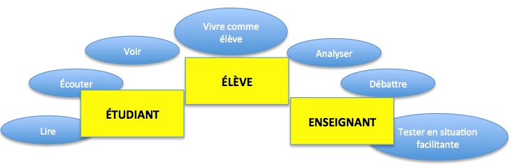 Dans la Haute Ecole Pédagogique (HEP) du Canton de Vaud comme dans la plupart des centres de formation d’enseignants, les programmes sont constitués de dispositifs divers : cours, séminaires, travaux pratiques, débats, lectures, travaux personnels. L’activité des étudiants se déploie également à partir de supports variés : l’énoncé professoral de concepts et de notions diverses, l’évocation de situations d’enseignement pour illustrer ces concepts, la lecture de documents didactiques, des extraits d’enregistrements vidéoscopiques d’enseignement. En EPS, nous plaçons aussi les étudiants dans des situations « comme dans une leçon d’EPS de primaire » pour leur donner des exemples précis d’organisation de la classe et leur faire vivre de l’intérieur des situations destinées à leurs élèves. Cette batterie de dispositifs en institution les fait passer dans des expériences diverses, les poussant tantôt à écouter, réfléchir, apprendre, lire, vivre des expériences d’élèves, ce qui les oblige à endosser alternativement des rôles d’étudiant, d’élève et d’enseignant (figure 1) :