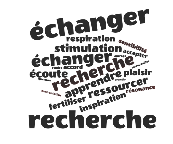 En lancement du séminaire, les animatrices nous ont invités à exprimer « quelque chose de soi » en lien avec des cartes de photolangage. Nous avons ensuite formulé, en un seul mot, ce qui nous avait conduits à nous inscrire à ce séminaire. Voici, ce qu’il en est résulté, sous forme de nuage de mots :