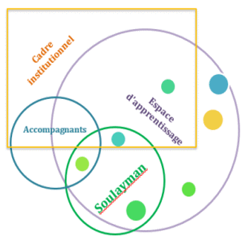 Le travail écrit individuel de fin de séminaire avait pour finalité de symboliser notre pensée. Au travers des situations de formation présentées et vécues, j’ai choisi d’élaborer un schéma type permettant de mieux circonscrire les thèmes abordés. Aussi, j’ai identifié, dans chacune des situations rencontrées, trois paramètres à prendre en compte : un apprenant, un accompagnement et un espace d’apprentissage qui légitime la présence des deux protagonistes et qui détermine également l’enjeu qui se jouera entre eux.