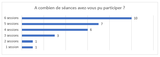 23 sur 28 répondant.es à cette question affichent une participation à au moins quatre séances sur six. Les cinq autres répondant.es affichent une participation moindre pour raisons familiales (décès d’un proche) et/ou de santé (reprise de traitements pour cause de récidive).
