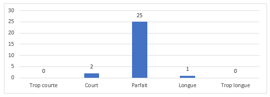 Pour 25 sur 28 répondant.es, le nombre de séances était « parfait » et aucun.e n’a trouvé la session trop longue. Le croisement des réponses à ces deux premières questions fait apparaitre le fait que l’évaluation très positive de la durée de la session (soit 6 séances de 2h) n’est pas nécessairement corrélée à la participation effective à la totalité de ces séances. En effet, sur les 25 répondant.es qualifiant cette durée de parfaite seuls 10 d’entre eux ont effectivement pu participer aux 6 séances proposées, les 15 autres ayant participé à 5, 4 voire 3 séances. Au moins deux interprétations de ce résultat co-existent selon nous : les patients ont ressenti le besoin de poursuivre au-delà des 4 séances auxquelles ils ont pu participer, et/ou les patients voient dans la proposition de 6 séances sur un cycle, la souplesse bienvenue pour absorber d’éventuelles indisponibilités. Cette lecture des résultats corrobore les réponses apportées à une enquête menée à l’issue des premiers GAP-ExP organisés à l’UdP-SU en 2022 sous la forme de session de quatre séances seulement et dans laquelle les participant.es avaient manifesté vouloir plus de séances. C’est d’ailleurs en tenant compte de cette demande que nous avons organisé des sessions de six séances en 2023.