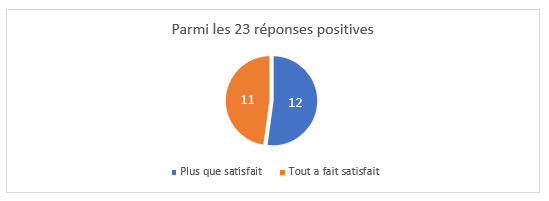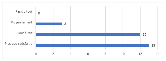 Par ailleurs, en effectuant le même croisement de données concernant les réponses positives à la question du sentiment d’efficacité, on constate que tous les participant.es ayant répondu positivement à cette question (23/28) se disent « plus que satisfait » (11/23) ou « tout à fait satisfait » (12/23) de leur participation aux GAP-ExP. (Cf. graphique 8).