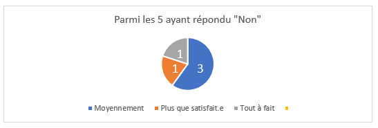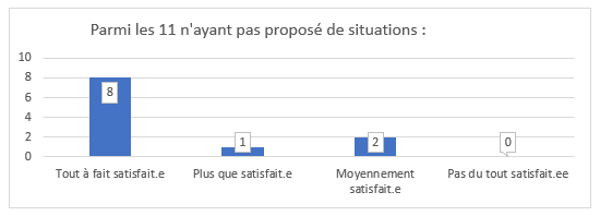 Pour affiner notre analyse quantitative, nous avons croisé les réponses des participants qui n’ont pas eu cette opportunité (11/28) d’avoir une analyse collective d’une situation (soit parce que leur situation n’a pas été retenue par le groupe, soit parce qu’ils/elles n’ont pas proposé de situation), avec celles apportées en termes de satisfaction (Q2 supra) :